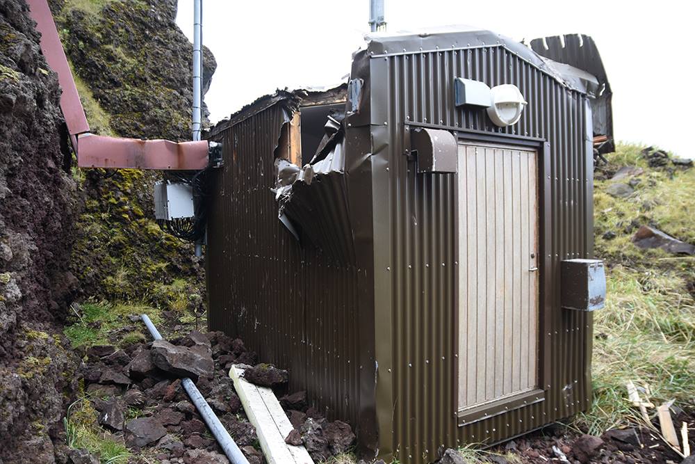 Vodafone gámurinn ónýtur eftir grjóthrun