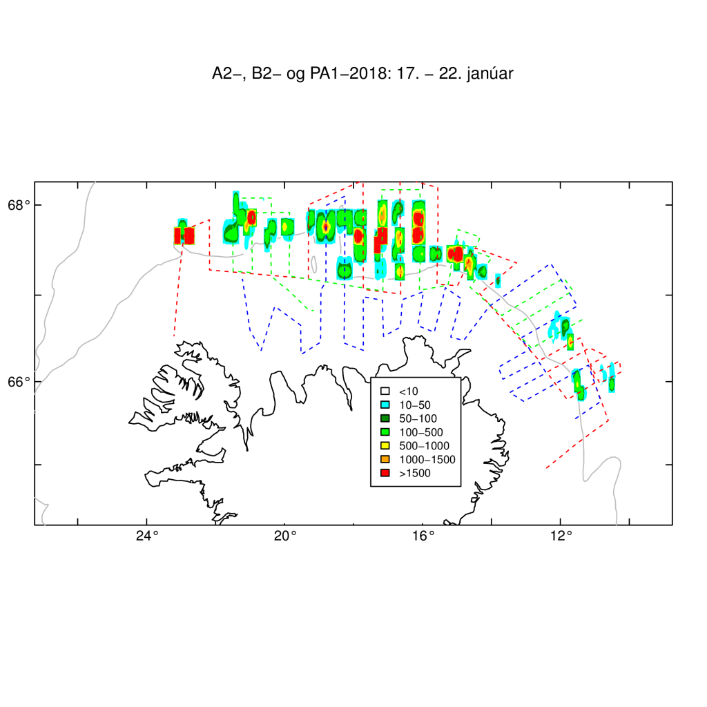 Í september – október 2017 fóru fram mælingar á stærð loðnustofnsins. �?á fannst kynþroska loðna aðallega á og við landgrunnið við Austur Grænland. Í þeim leiðangri mældust samtals 945 þúsund tonn af kynþroska loðnu og mæliskekkja (CV) var 0.29. Í framhaldi þeirra mælinga var, í samræmi við gildandi aflareglu, úthlutað 208 þúsund tonnum en jafnframt […]