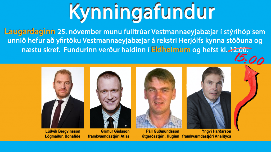 Laugardaginn 25. nóvember munu fulltrúar vestmannaeyjabæjar í stýrihóp sem unnið hefur að yfirtöku Vestmannaeyjabæjar á rekstri Herjólfs kynna stöðuna og næstu skref. Fundurinn er í eldheimum og hefst klukkan 15:00. (meira…)