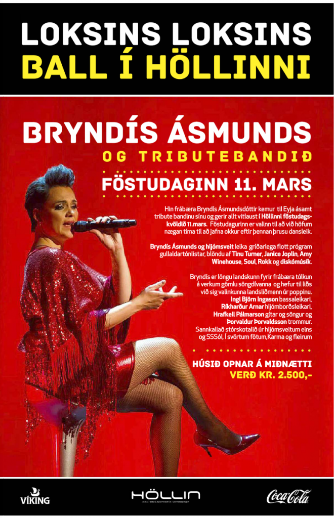 Hin frábæra Bryndís Ásmundsdóttir kemur til Eyja ásamt tribute bandi sínu og gerir allt vitlaust í Höllinni í kvöld, 11.mars. Bryndís og hljómsveit leika gríðalega flott prógramm gullaldartónlistar, blöndu af Tinu Turner, Janis Joplin, Amy Winehouse, soul, rokk og diskótónlist. Bryndís er löngu landskunn fyrir frábæra túlkun á verkum gömluu söngdívanna og hefur til liðs […]