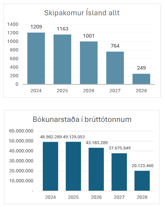 Skipulagning og bókanir skemmtiferðaskipa eru unnar 2–4 ár fram í tímann og því munum við einungis sjá lítilsháttar breytingu á þessu ári. Það er hins vegar fyrirséður 17% samdráttur í heildarskipakomum á næsta ári og 37% samdráttur á árinu 2027, miðað við árið 2024. Ef við skoðum breytingar í brúttótonnum, sem gefa raunsæja mynd af heildarumsvifum, þá er áætlaður samdráttur 12% á næsta ári og 23% á árinu 2027, miðað við árið 2024. Bókunarstaðan gefur til kynna að minni skip komi síður en þau hafa einmitt einnig sótt minni hafnir hringinn í kringum landið. Þótt að bókunarstaða sé í raun alltaf áætlun, þá hefur verið hægt að áætla með nokkurri vissu 1,5 til 2 árum fram í tímann miðað við þá hefð sem hefur skapast í bókunum og því eru þessar tölur teknar alvarlega.