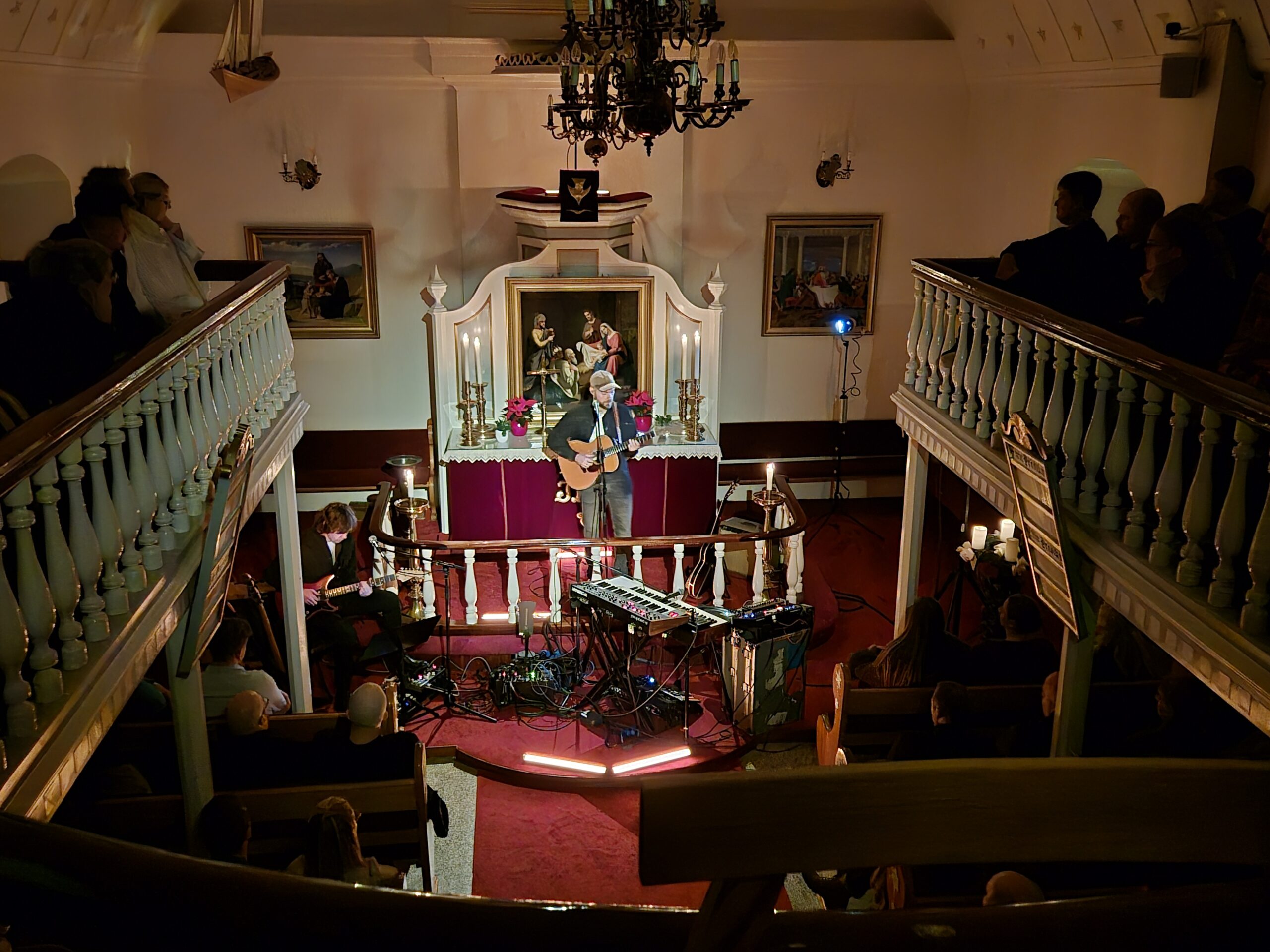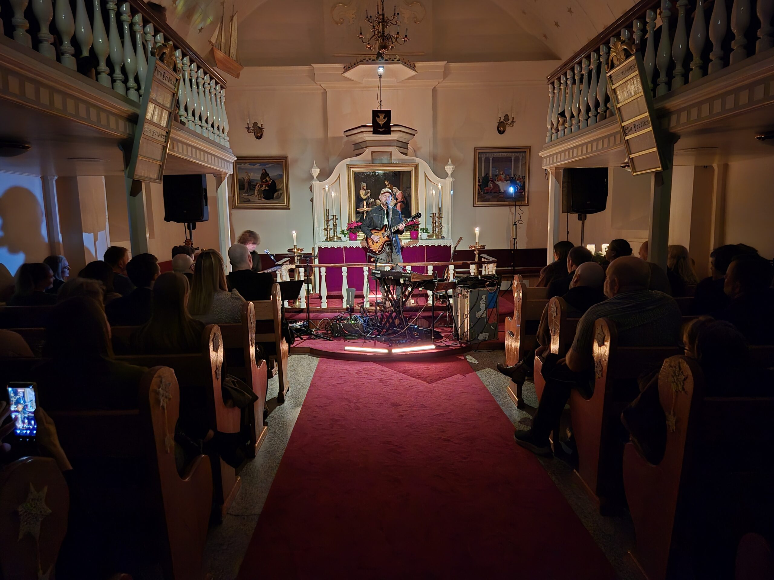 Landakirkja var þéttsetin í kvöld þegar Ásgeir Trausti hélt aðventutónleika í kirkjunni. Tónleikarnir eru hluti af tónleikaferð hans um landið nú í desember. Ásgeir flutti perlur úr sínum vinsælu lagasafni á nærgöngulan og hlýjan hátt, og skapaði einkar notalega stemningu í helgidóminum.