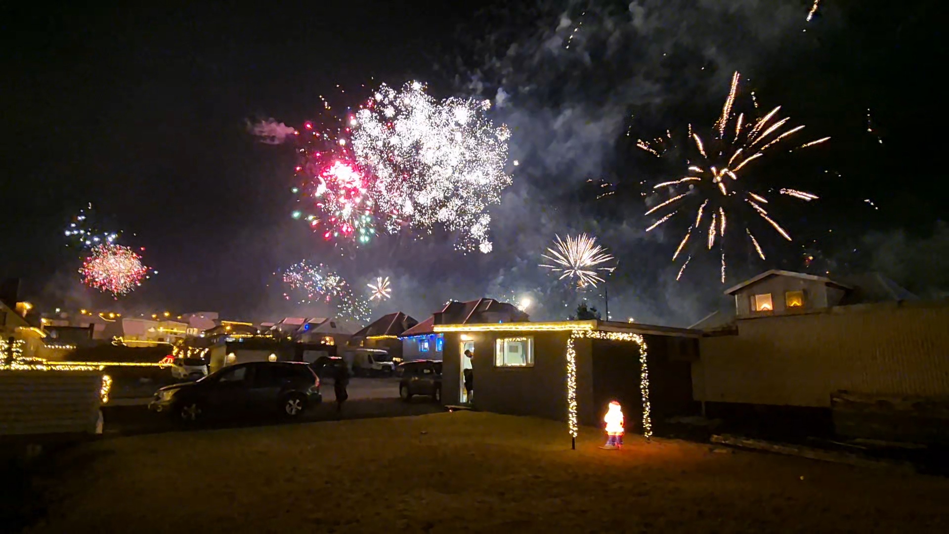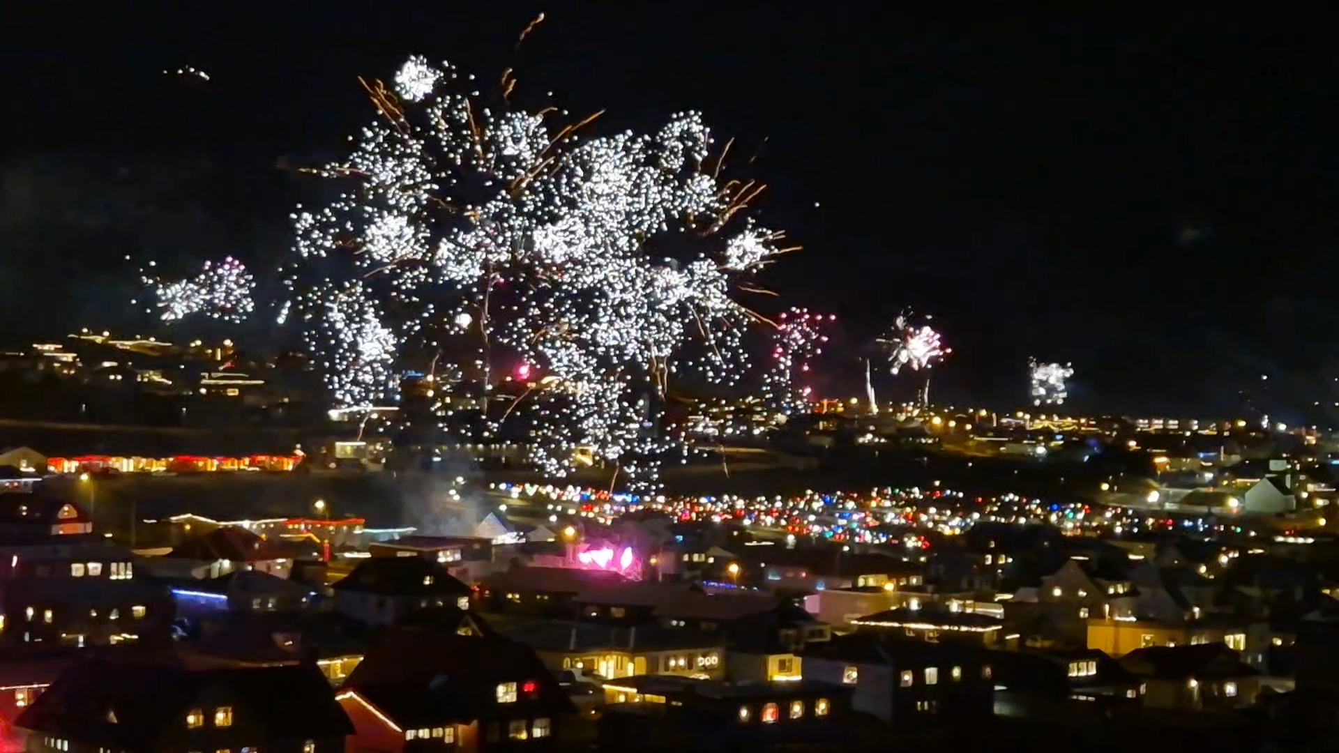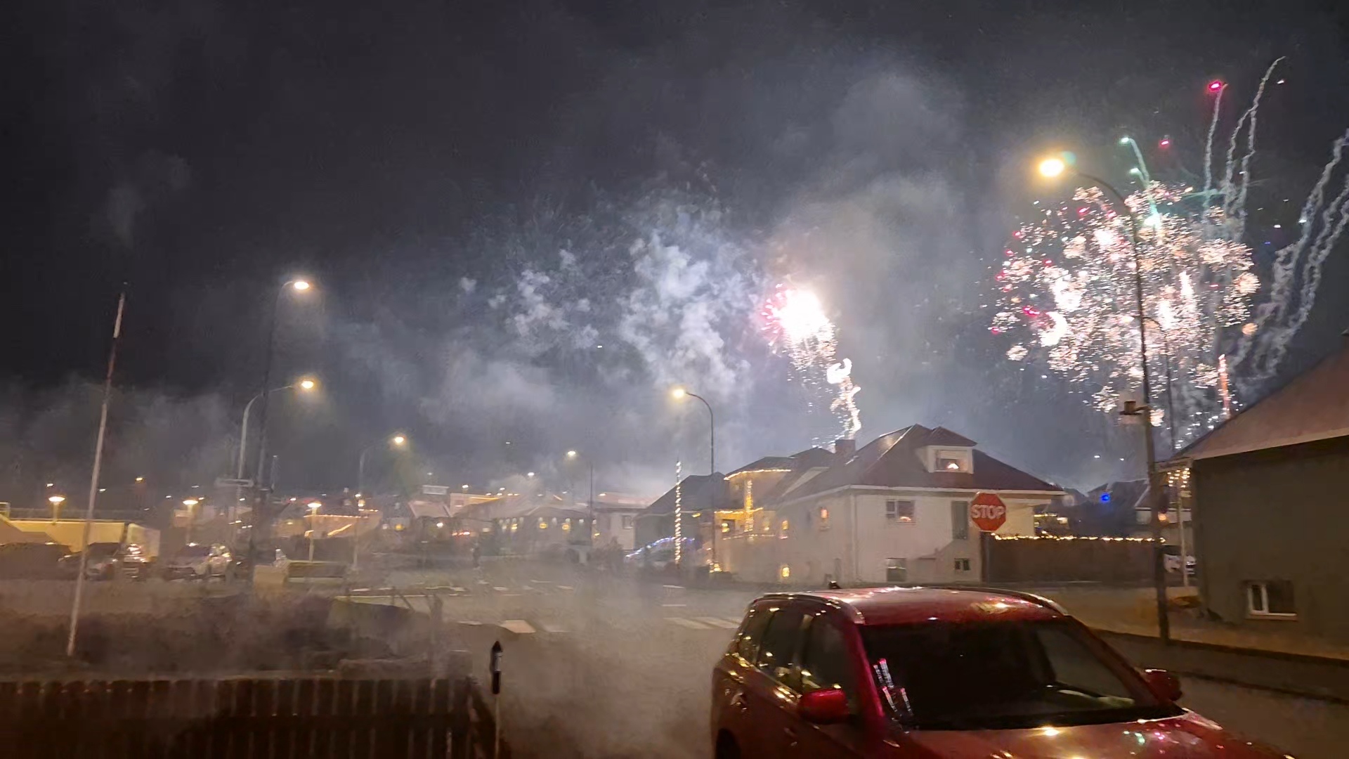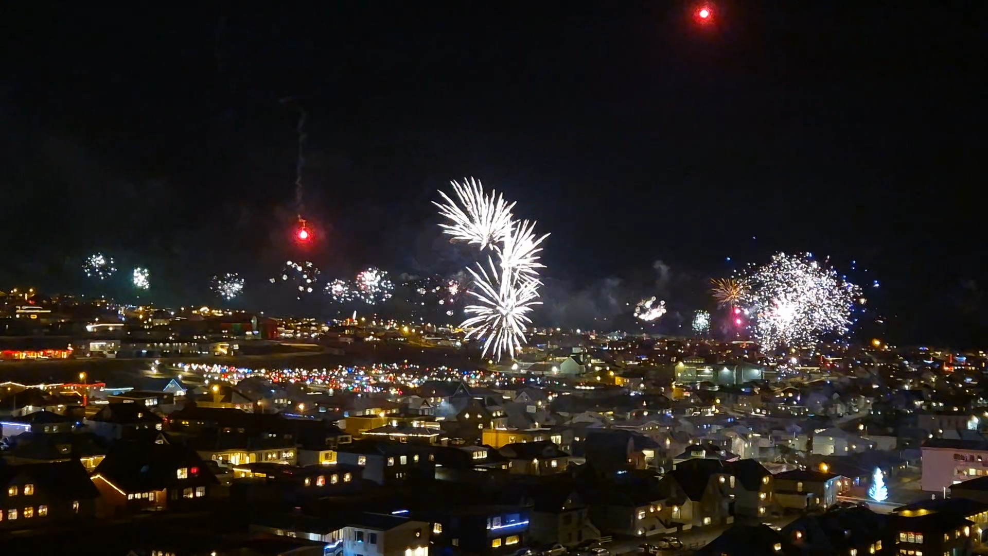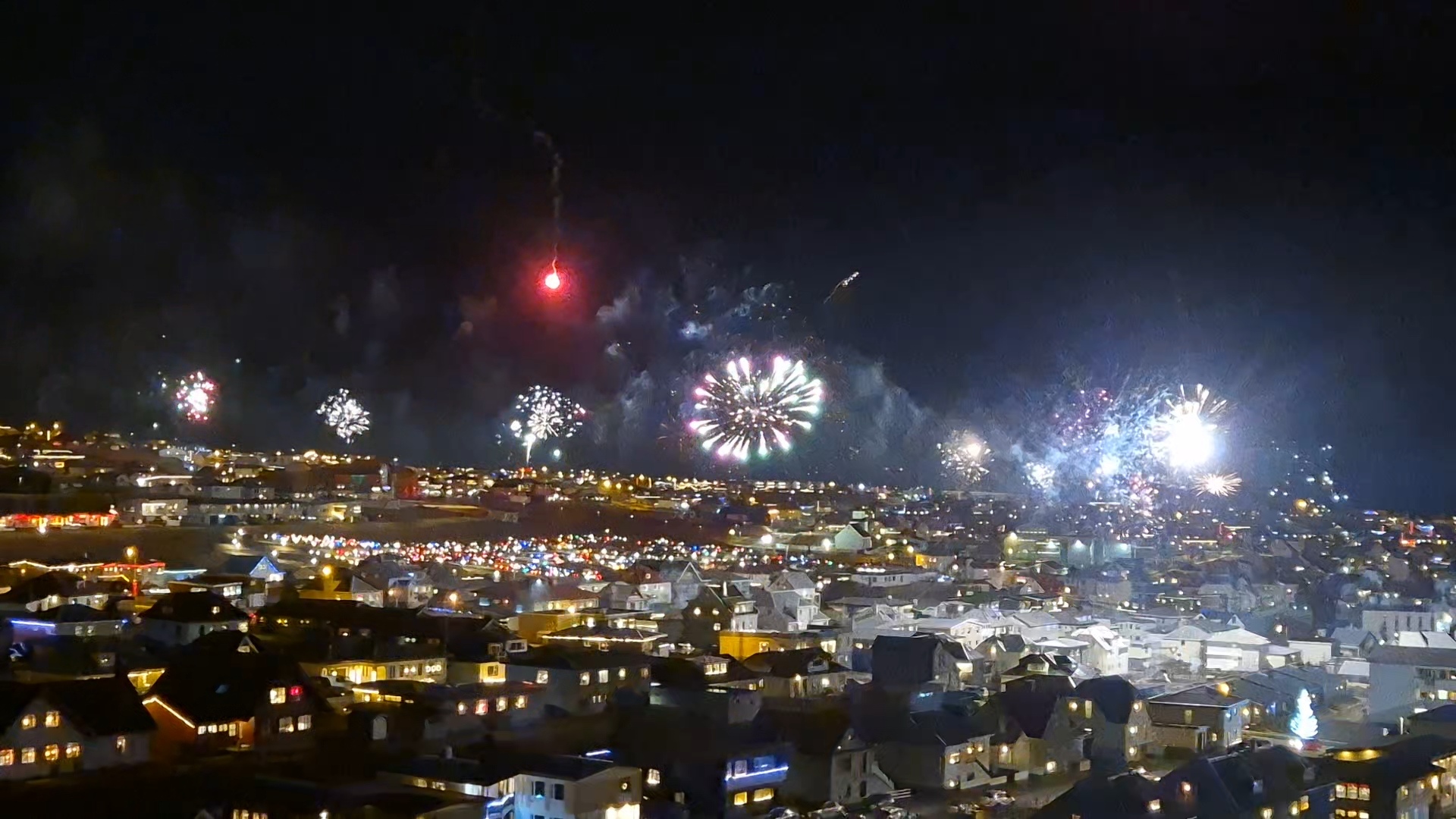 Áramótin í Vestmannaeyjum voru einstaklega glæsileg að þessu sinni. Mikið var skotið upp af flugeldum þegar árið kvaddi. Himinninn lýstist upp í öllum regnbogans litum og víða mátti sjá fólk safnast saman til að njóta sýningarinnar.