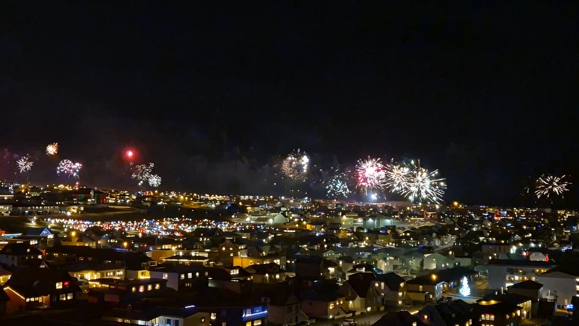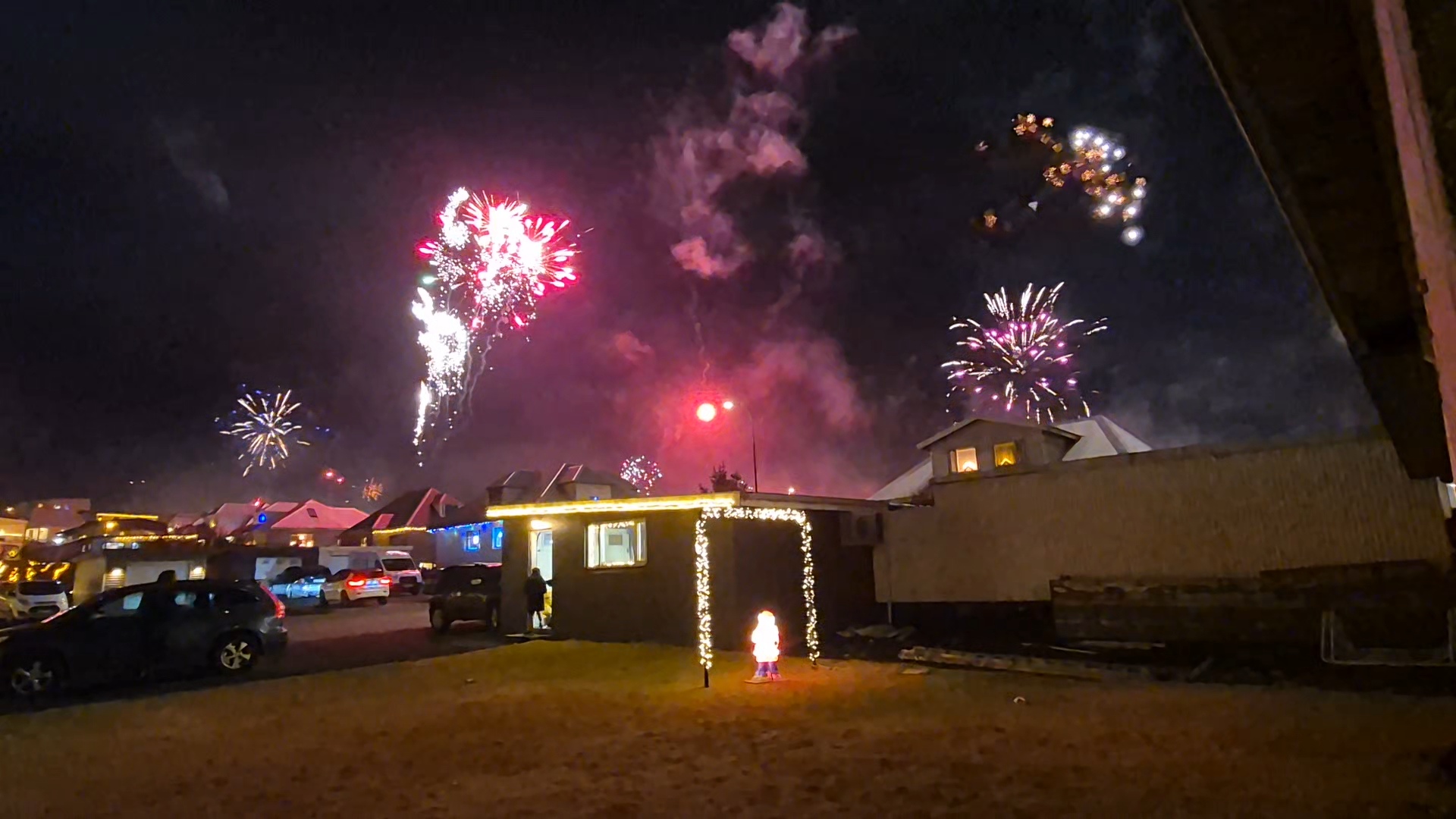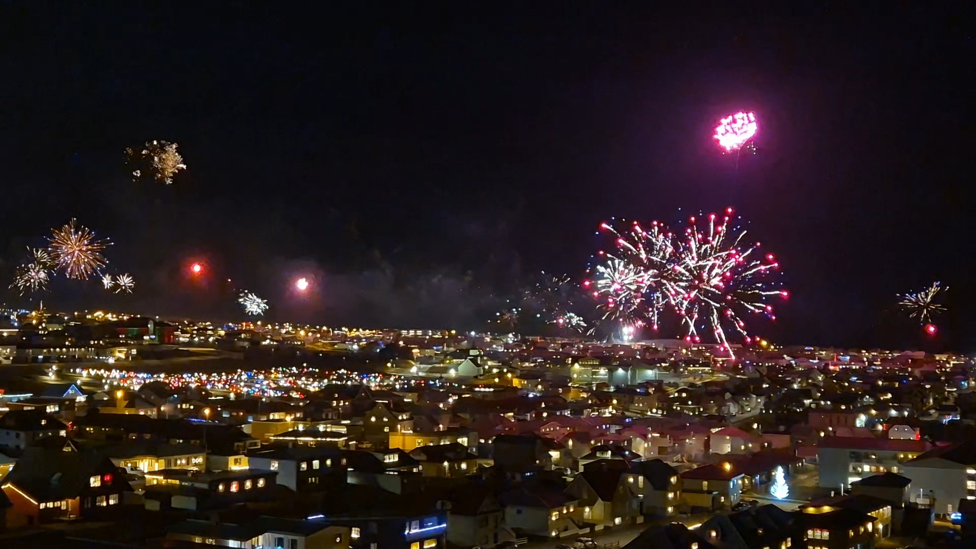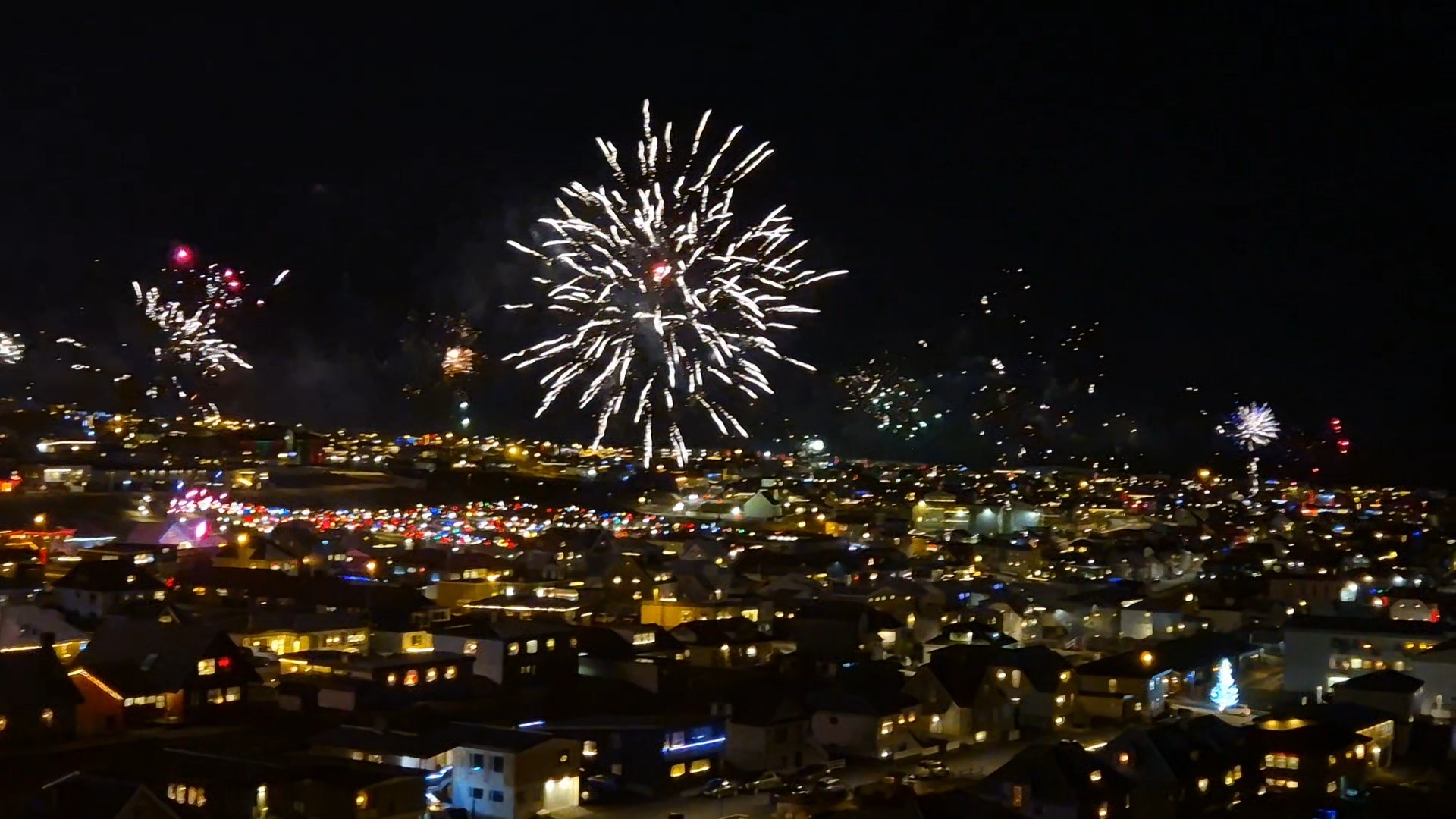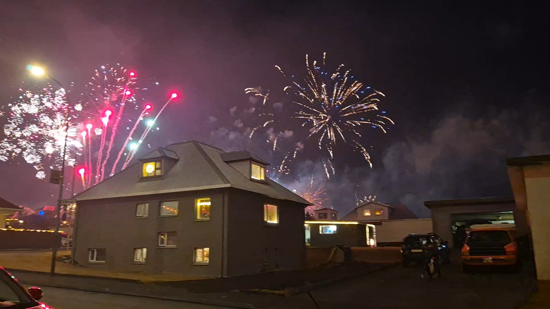 Áramótin í Vestmannaeyjum voru einstaklega glæsileg að þessu sinni. Mikið var skotið upp af flugeldum þegar árið kvaddi. Himinninn lýstist upp í öllum regnbogans litum og víða mátti sjá fólk safnast saman til að njóta sýningarinnar.