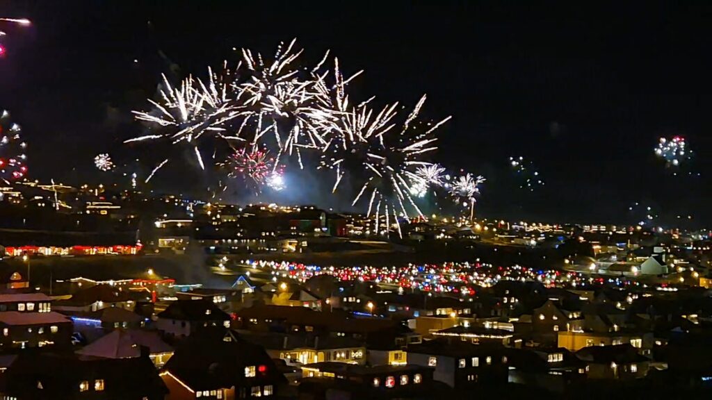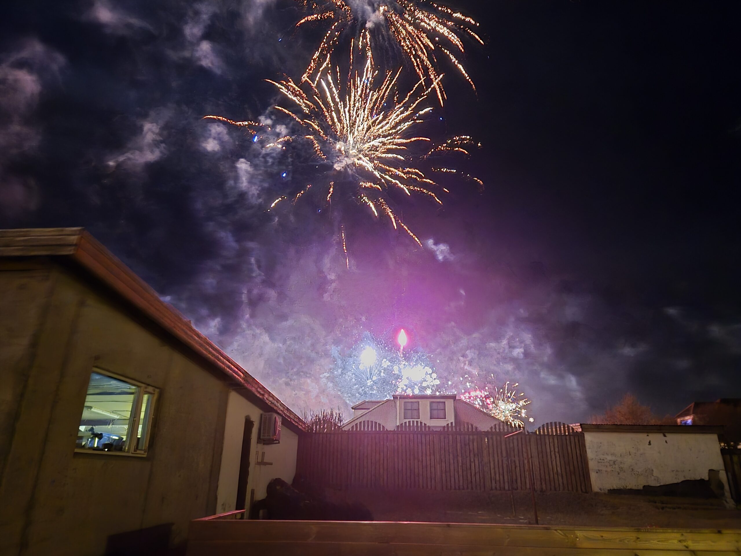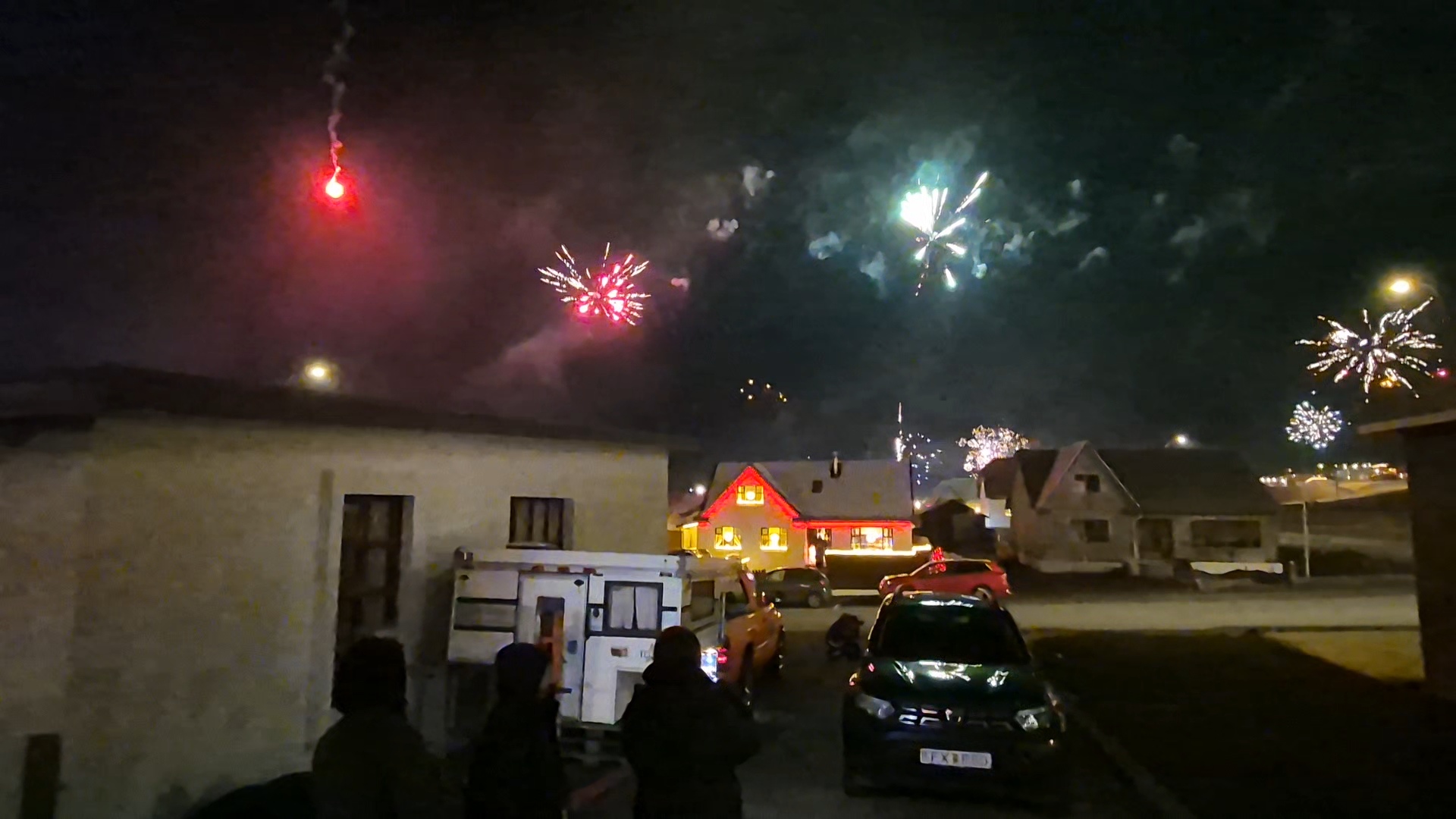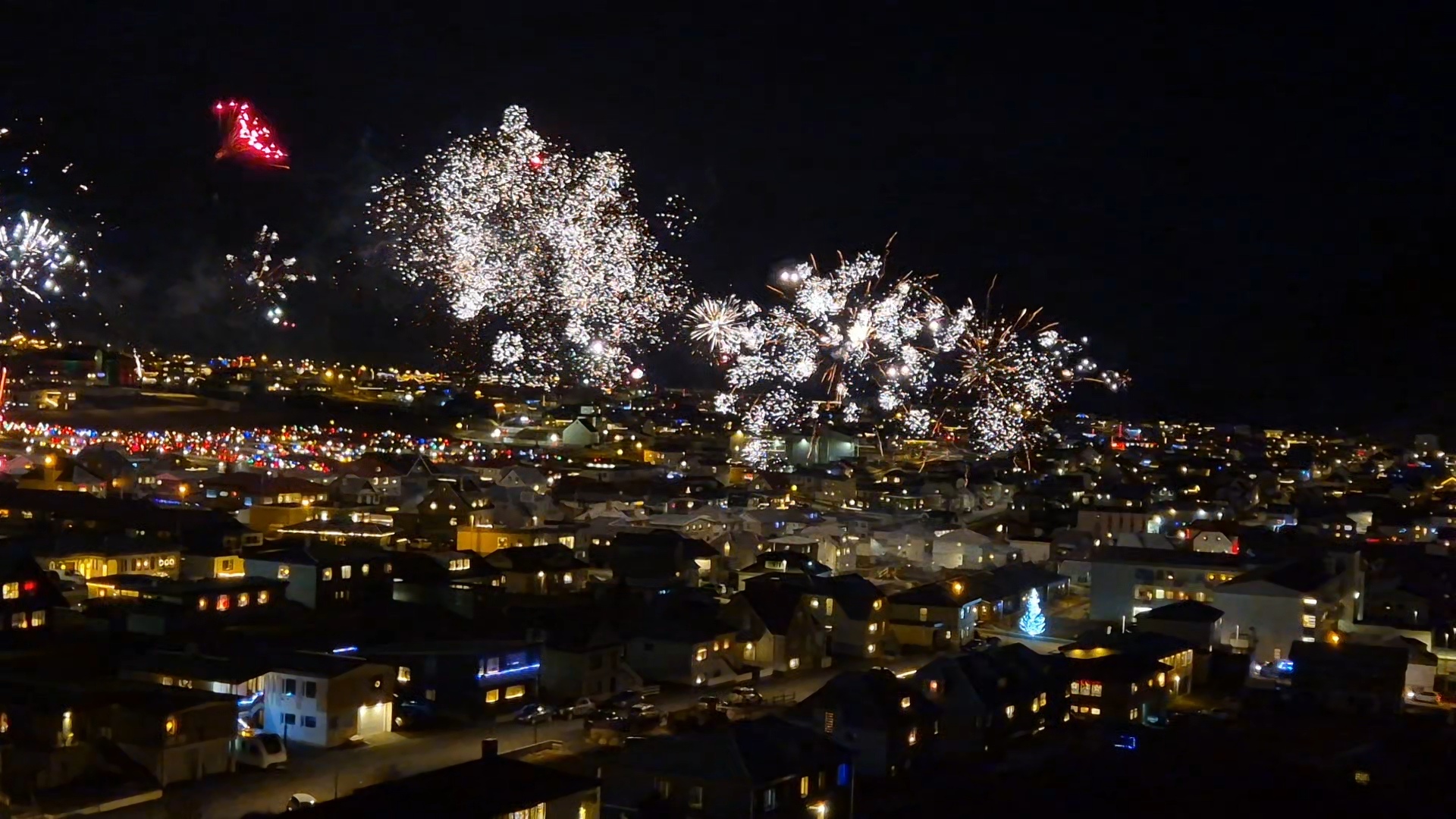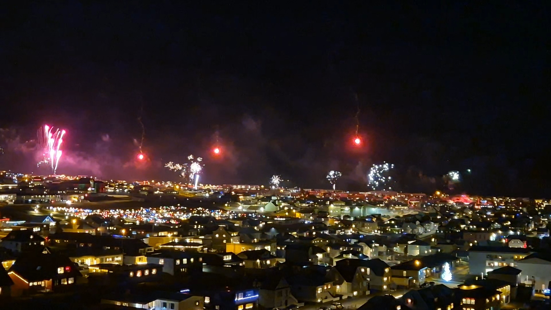 Áramótin í Vestmannaeyjum voru einstaklega glæsileg að þessu sinni. Mikið var skotið upp af flugeldum þegar árið kvaddi. Himinninn lýstist upp í öllum regnbogans litum og víða mátti sjá fólk safnast saman til að njóta sýningarinnar.