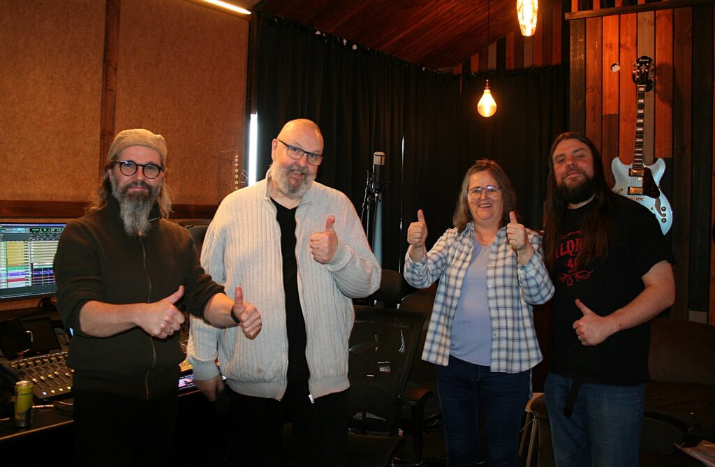 Fagnað. Fagna því að búið sé að taka upp alla lagagrunna, Arnór Vilbergsson píanó, Jóhann Ásmundsson, bassaleikari, texta- og tónskáldið Guðrún Erlingsdóttir/Rúna og Ásmundur Jóhannsson trommari. Á myndina vantar Sigurgeir Sigmundsson gítarleikara.