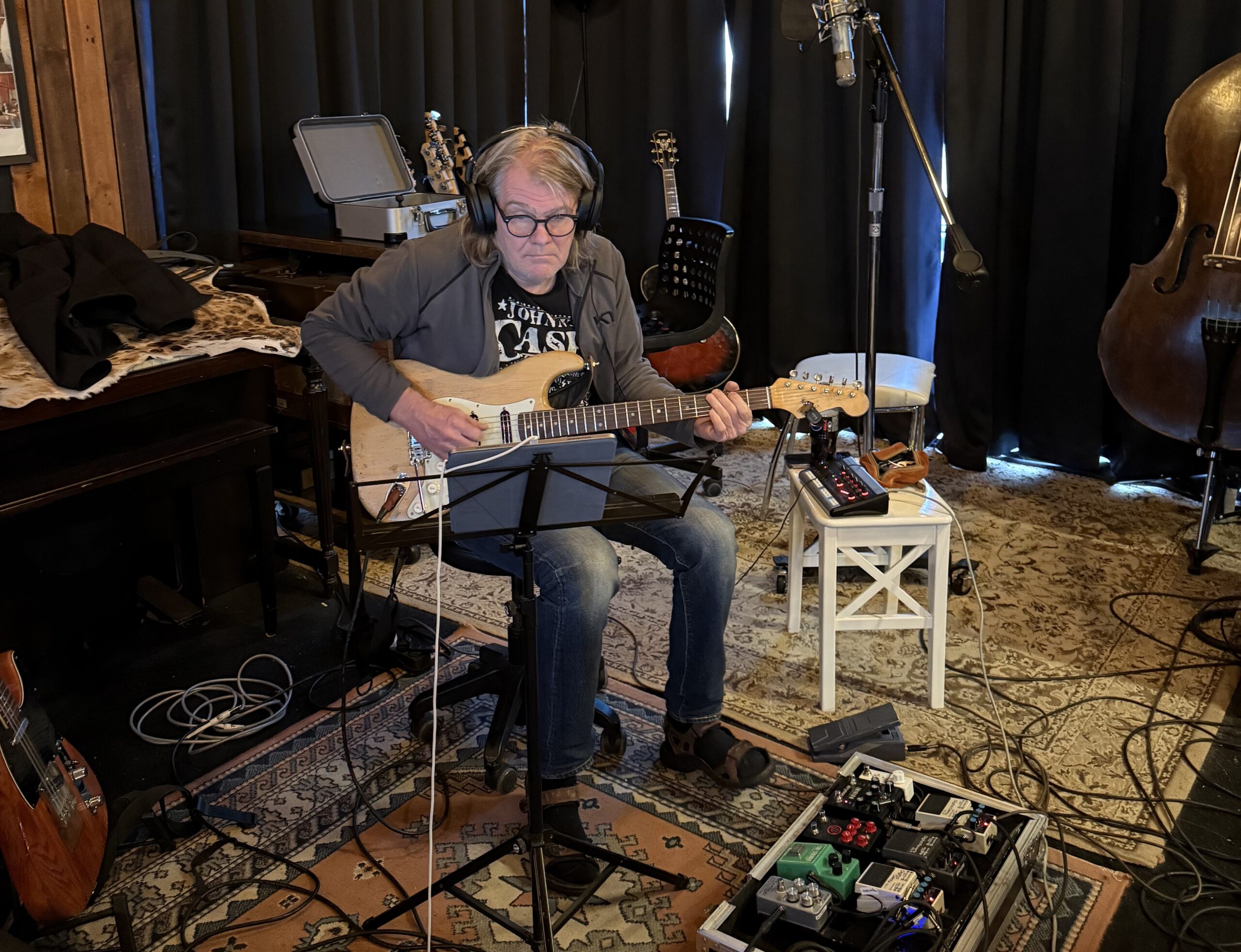 Verið að gera klárt fyrir upptökur á grunnum laganna.