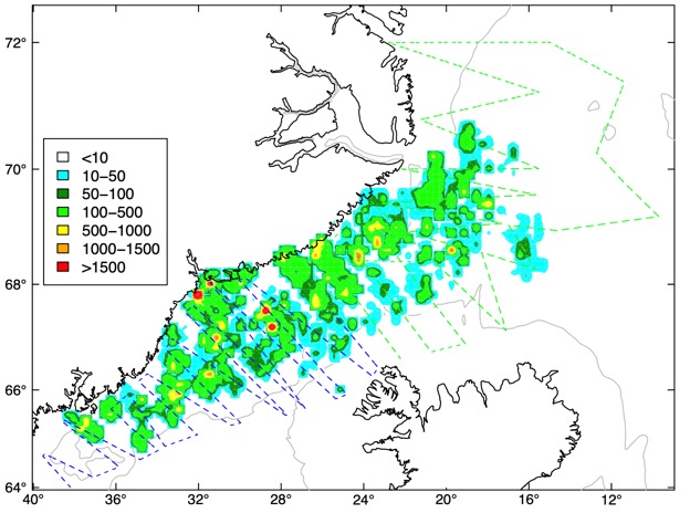 ásamt dreifingu loðnu samkvæmt bergmálsgildum.