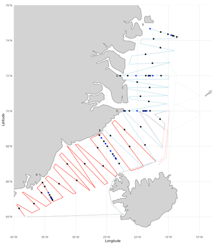 Mynd 1. Fyrirhugaðar leiðarlínur rannsóknaskipanna Tarajoq (rauð lína) og Árna Friðrikssonar (blá lína) við loðnumælingar haustið 2025. Sýnatökustöðvar með mismunandi búnaði fyrir vistkerfisrannsóknir eru sýndar sem punktar.