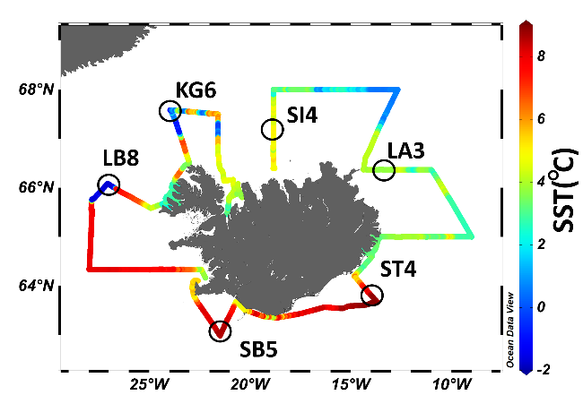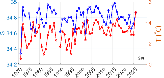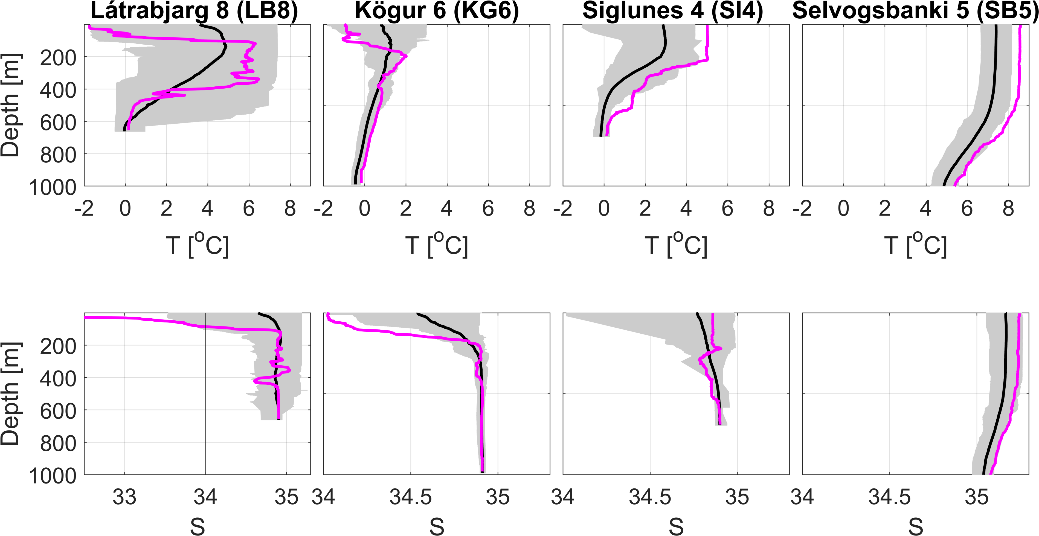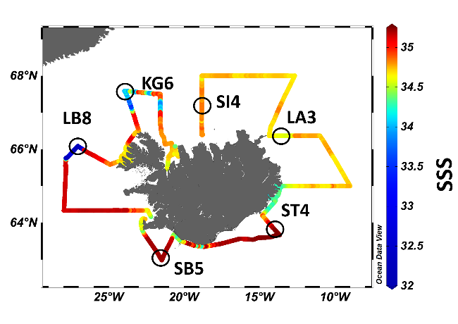 Á móti hefur selta á ytri stöðvunum í Grænlandssundi (LB8 og KG6) ekki mælst lægri í yfirborðslaginu í fyrri vetrarleiðöngrum og hitastigið var einnig mjög lágt. Þessar stöðvar liggja þó yfirleitt í Austur-Grænlandsstraumnum þar sem pólsjór er ríkjandi (myndir 2 og 3).