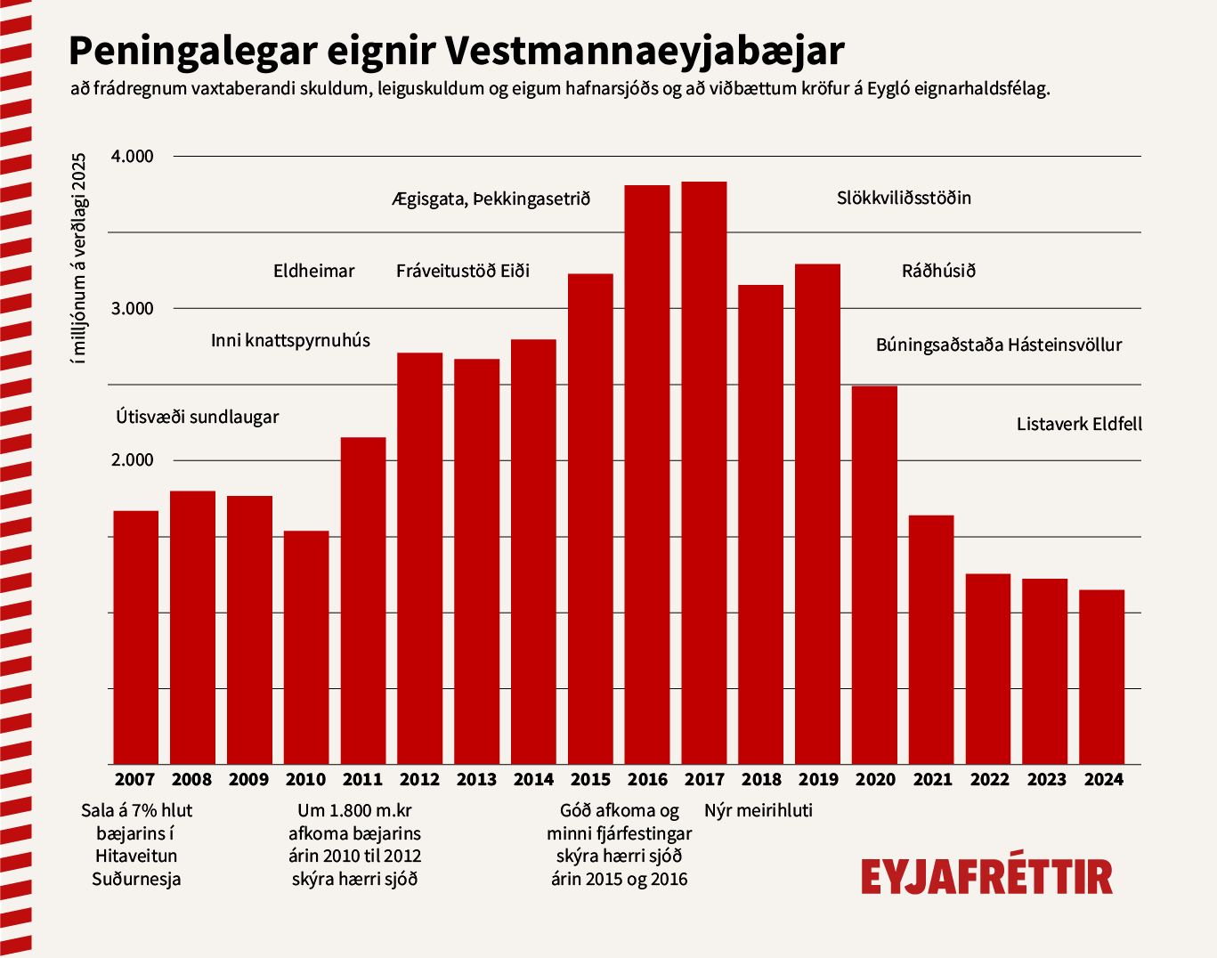 Við sölu á hlutafé bæjarins á 7% hlut í hitaveitunni varð til myndarlegur sjóður sem hefur nýst til margvíslegrar framkvæmda og hefur vaxið og dregist saman. Þannig stækkaði sjóðurinn úr 1,5-2 milljörðum á núvirði í tæpa 4 milljarða á 6-7 árum en bærinn skilaði góðri afkomu á tímabilinu. Í dag reiknum við hjá Eyjafréttum að sjóðurinn sé rúmlega einn milljarður.