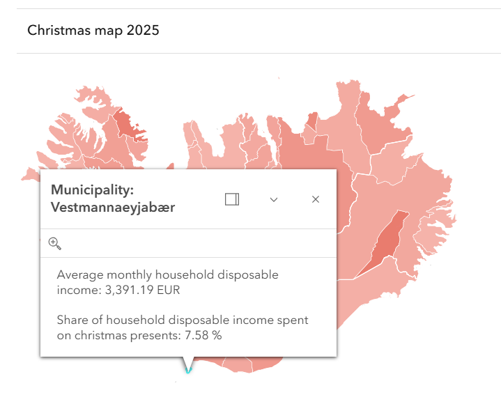 Íbúar í Vestmannaeyjum verja að jafnaði 7,58% af ráðstöfunartekjum heimila í jólagjafir samkvæmt nýrri samantekt frá Nordregio, sem kortleggur jólagjafaeyðslu á Norðurlöndum eftir sveitarfélögum.