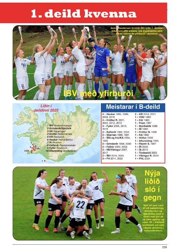 „ÍBV leikur á ný í Bestu deild kvenna árið 2026 eftir tveggja ára fjarveru og hafði umtalsverða yfirburði í 1. deildinni 2025. Nýtt og sameiginlegt lið Grindavíkur og Njarðvíkur kom verulega á óvart með því að ná öðru sætinu og fylgir Eyjakonum upp í deild þeirra bestu. Grindavík/Njarðvík vann ÍBV í fyrstu umferð deildarinnar í byrj un maí og þar með höfðu Eyjakonur tapað sínum eina leik. Þær unnu sextán leiki og gerðu eitt jafntefli í þeim sautján leikjum sem eftir voru og ljóst varð upp úr miðju sumri að þær yrðu ekki stöðvaðar,“ segir um glæsilega framgöngu kvennanna í sumar.