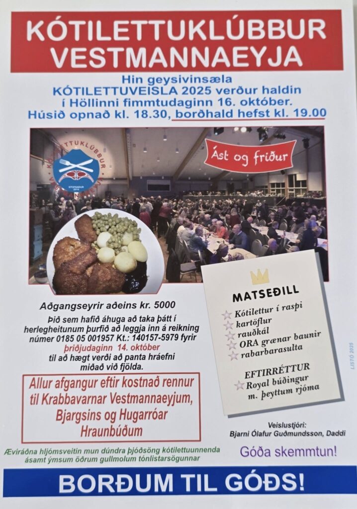 „Kæru konur í Vestmannaeyjum. Eftir öll þessi ár var okkur að berast til eyrna sá leiðinlegi misskilningur að margar konur halda að kótilettukvöldið væri bara fyrir karla. Að þetta væri karlakvöld sem er bara algjört bull, það koma margar konur á kvöldið og hafa gert öll árin okkar. Þið eru allar hjartanlega velkomnar á kótilettukvöldið nk. fimmtudag, munið bara að staðfesta komu ykkar, við tökum vel á móti ykkur,“ segir í tilkynningu frá aðstandendum Kótilettuklúbbins sem slá upp sinni árlegu kótilettuveislu í Höllinni annað kvöld.