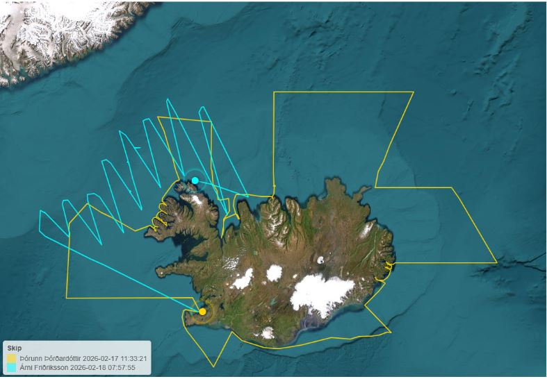 Leiðarlínur Árna Friðrikssonar í loðnumælingum 10.- 18. febrúar og leiðarlínur Þórunnar Þórðardóttur