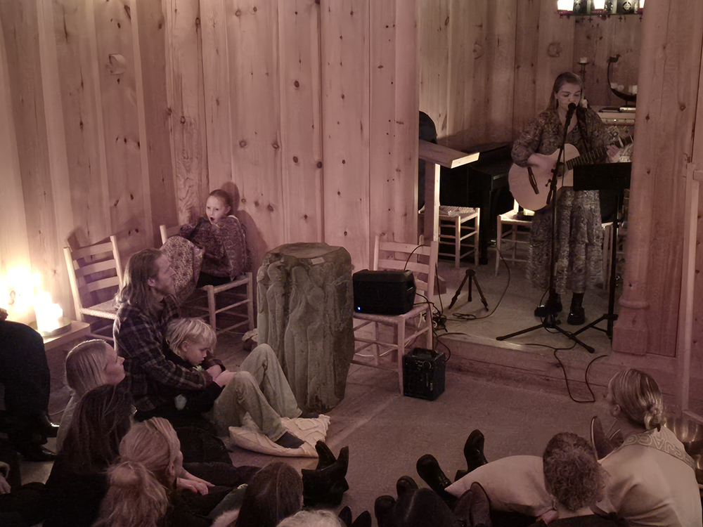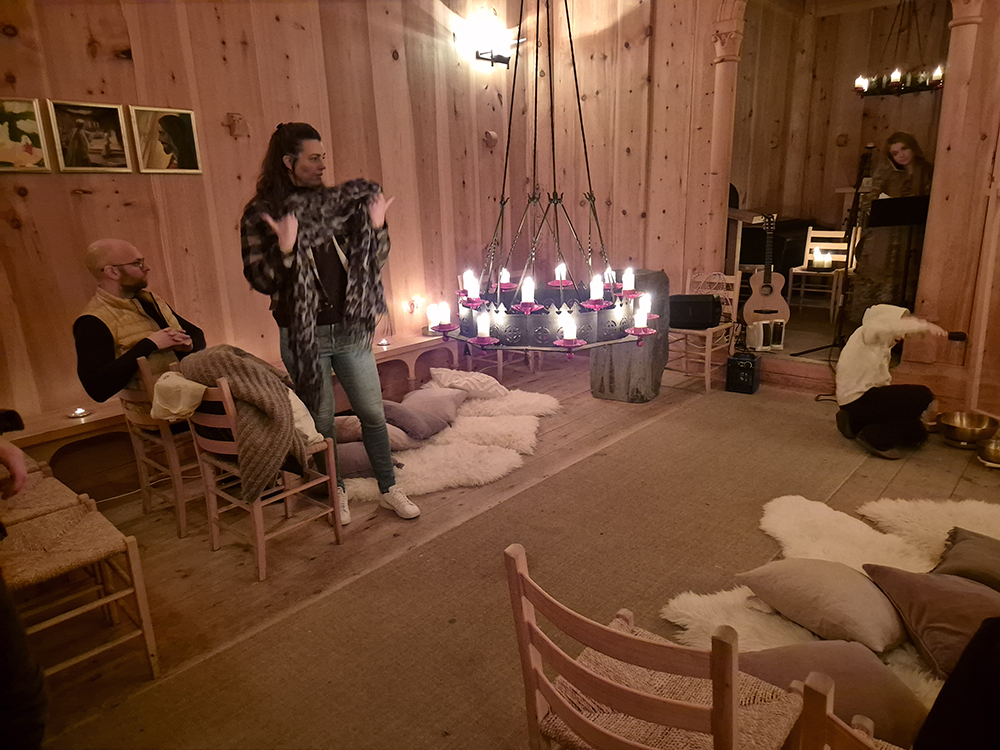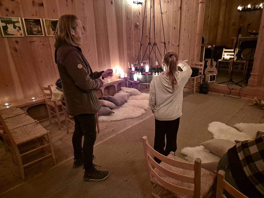 Kertaljós, jurtate, söngur og mildir tólar fylltu kirkjuna og mynduðu hlýja og friðsæla stemningu.