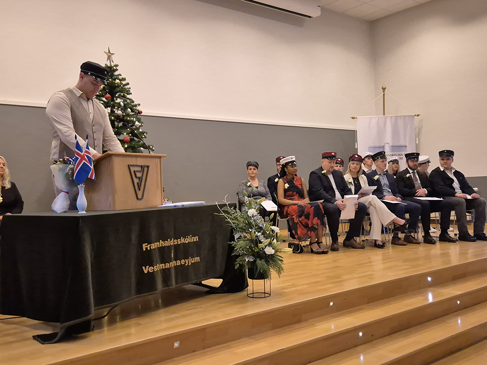 „Ég er að ljúka þremur góðum árum hérna núna. Ég kannast þó aðeins við að útskrifast, ég lauk námi á félagsvísindabraut haustið 2020. Þá var hins vegar engin formleg útskrift, vegna COVID,“ sagði Sigurður Ragnar Steinarsson útskriftarnemi sem ávarpaði gesti á skólaslitunum fyrir hönd nemenda.