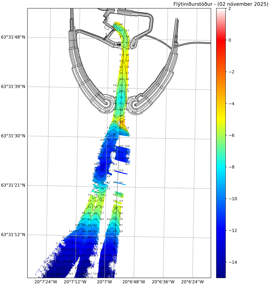 Nýjustu dýptarmælingar sem gerðar voru í morgun í Landeyjahöfn sýna að dýpið er enn ófullnægjandi til reglulegra siglinga. Þetta kemur fram í tilkynningu frá Herjólfi ohf.
