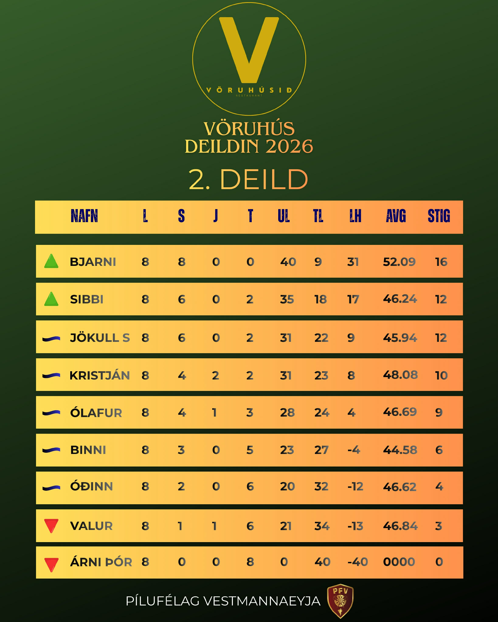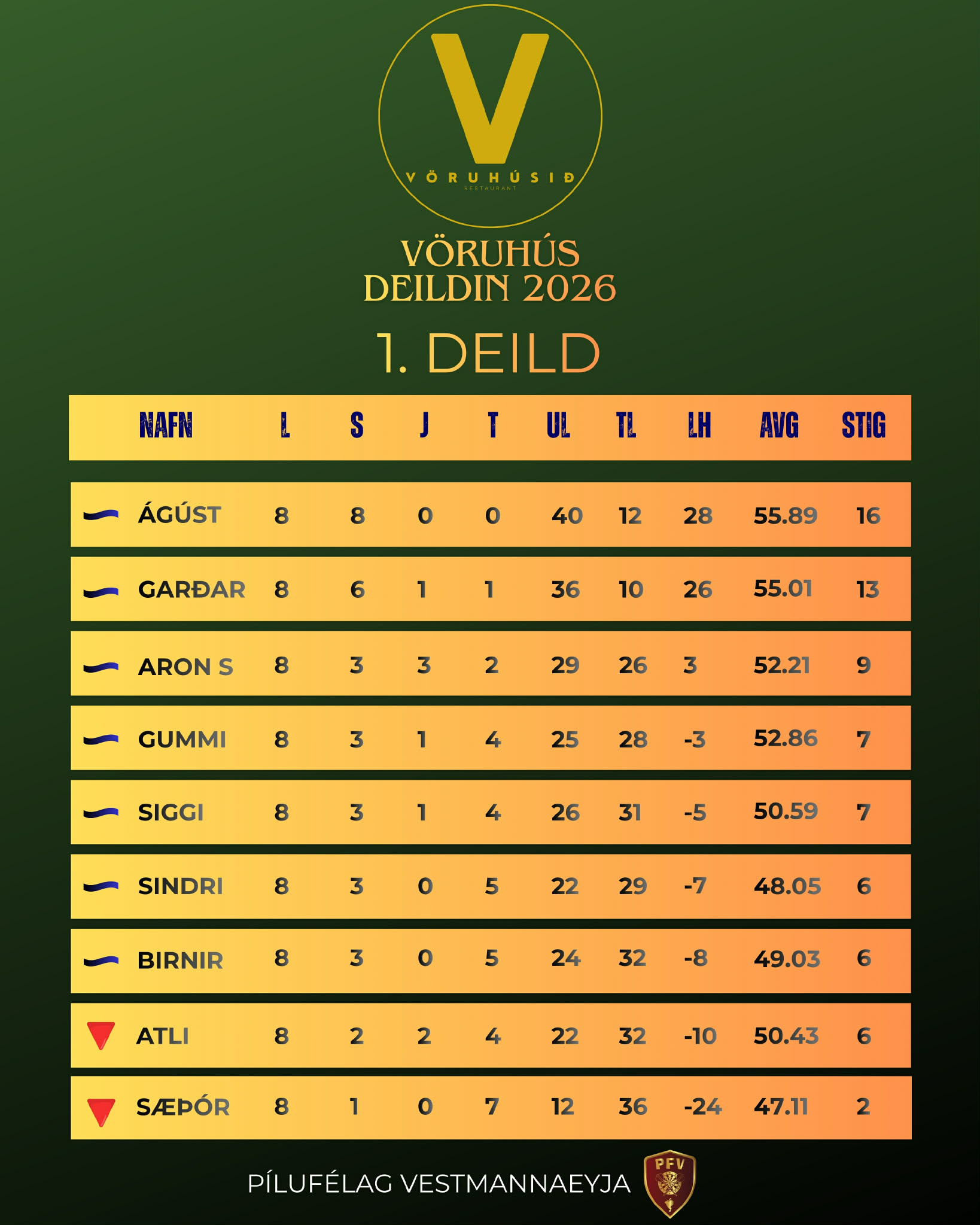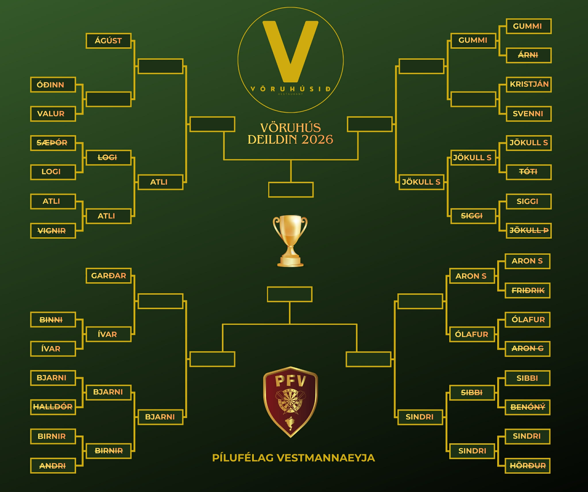 Sigurvegari verður að lokum krýndur laugardagskvöldið 28. mars næstkomandi upp í Höll en undanúrslitin og úrslitin fara fram þar. Dyrnar opna klukkan 18:00 og fyrri undanúrslitaleikurinn byrjar 19:00. Að sjálfsögðu verður Vöruhúsið með léttar veitingar til sölu fyrir svanga og hægt verður að svala þorstanum á barnum. Við hjá Pílufélaginu hvetjum alla til að taka kvöldið frá, styðja við strákana og starfið okkar.