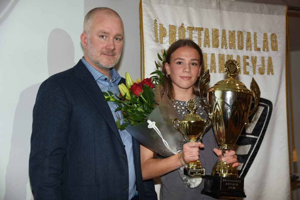 Tanja og Gunnar Páll formaður ÍBV-Íþróttabandalags þegar viðurkenningar voru veittar við athöfn í síðasta mánuði. Mynd Óskar Pétur.