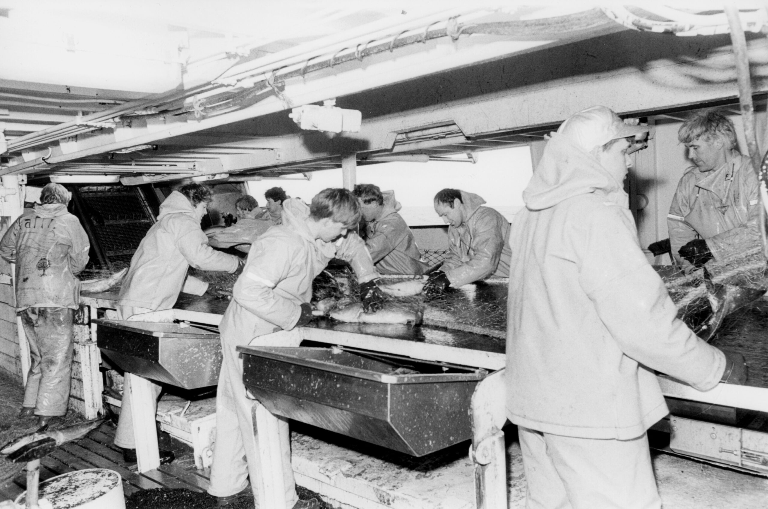Á fullu í aðgerð um borð í Þórunni Sveinsdóttur VE-401, 2. maí 1989. Mynd: Sigurgeir Jónasson.