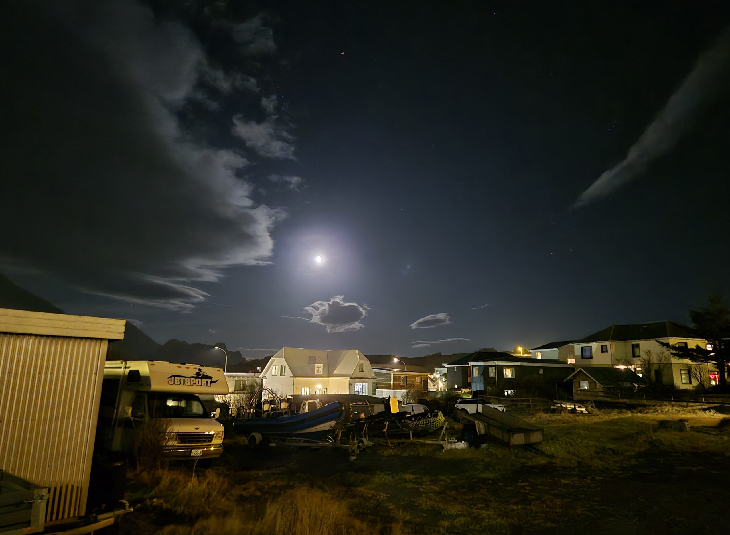 Tunglið, tunglið taktu mig og berðu mig upp til skýja. Hugurinn ber mig hálfa leið í heimana nýja. svona hefst texti lagsinsTunglið, tunglið taktu mig eftir Theodoru Thoroddsen. Hann á ágætlega við þessar flottu myndir sem Óskar Pétur Friðriksson, ljósmyndari Eyjafrétta tók seint í gærkvöldi af tunglinu að lýsa upp dimman himininn.