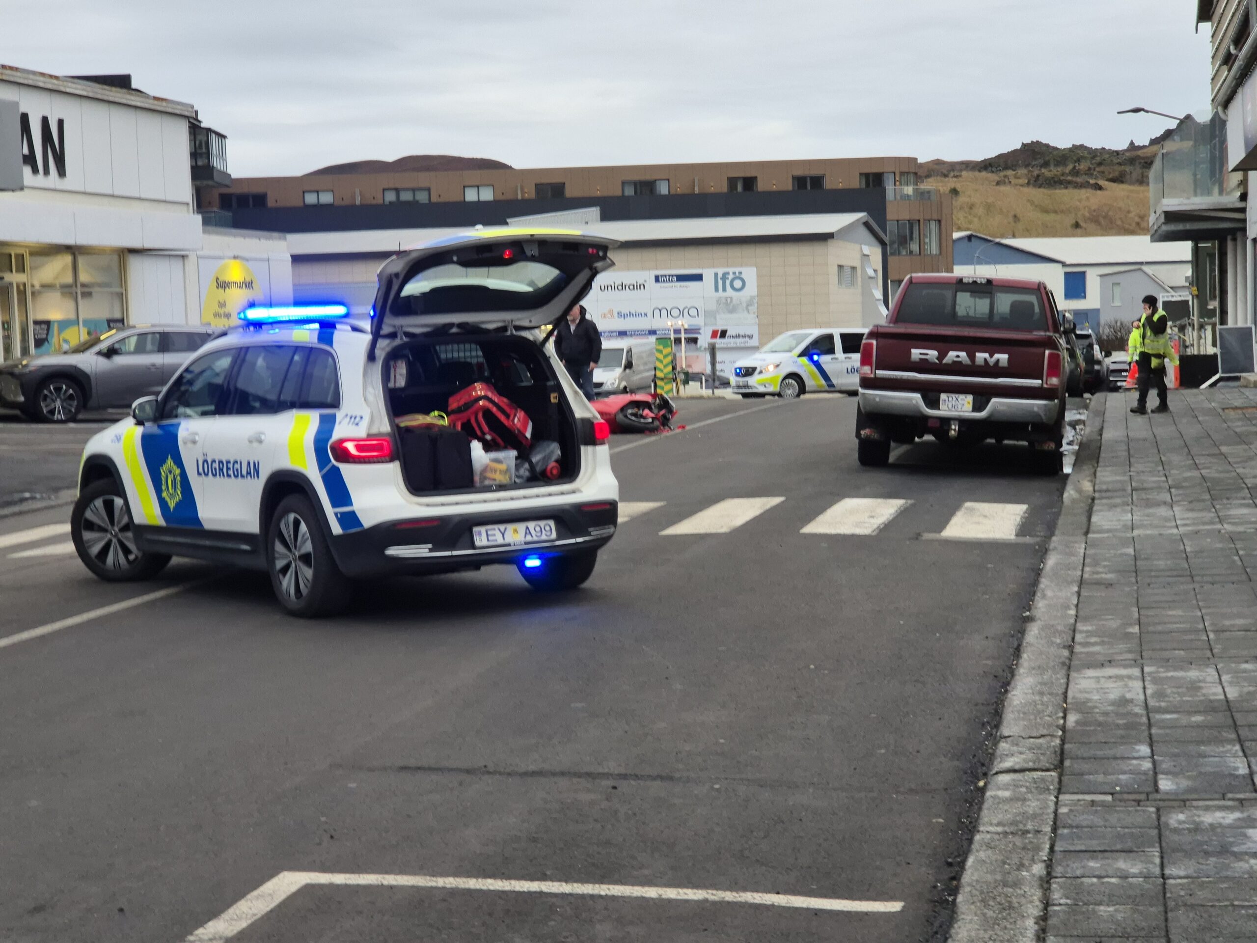 „Þarna hafði orðið umferðaróhapp milli bifreiðar og bifhjóls. Bifhjólið er mikið skemmt og ökumaður fluttur á HSU til skoðunar, en meiðslin eru ekki talin alvarleg á þessari stundu. Bifreiðin skemmdist minna. Götunni var lokað í skamma stund á meðan vettvangsrannsókn fór fram,“ segir Stefán.