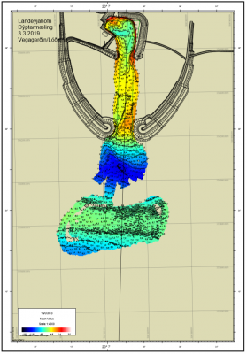 Dýpkunarskipið Sóley sem getur dýpkað utan hafnar en ekki í hafnarmynninu er ekki að störfum þar sem hennar reynist ekki þörf, sjá má á myndinni sem fylgir fréttinni hvernig dýpið er minnst á milli garðanna.