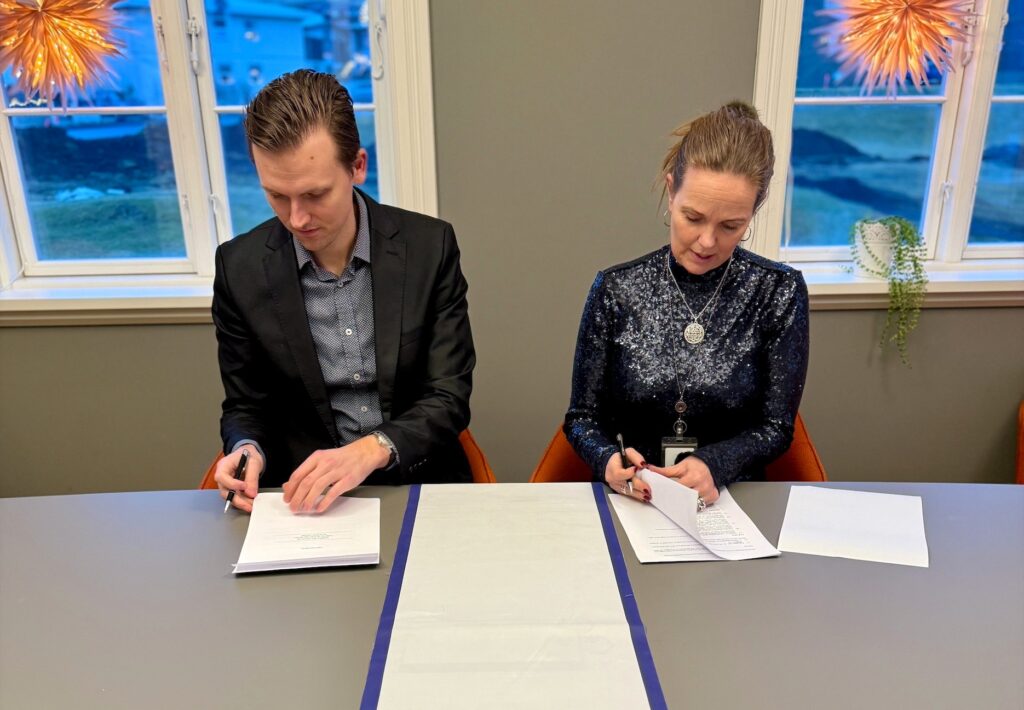 Haraldur og Íris skrifa undir. Ljósmynd/vestmannaeyjar.is.